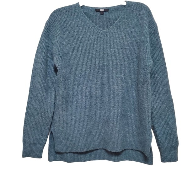 Cozy V-neck ribbed sweater. SUPER Soft knit fabric. Muted teal/greenish blue. Split and slight high low hem. Perfect for layering. Unisex! Check measurements below.